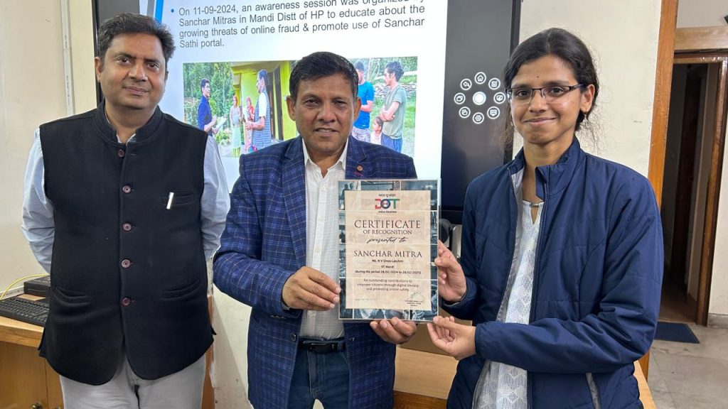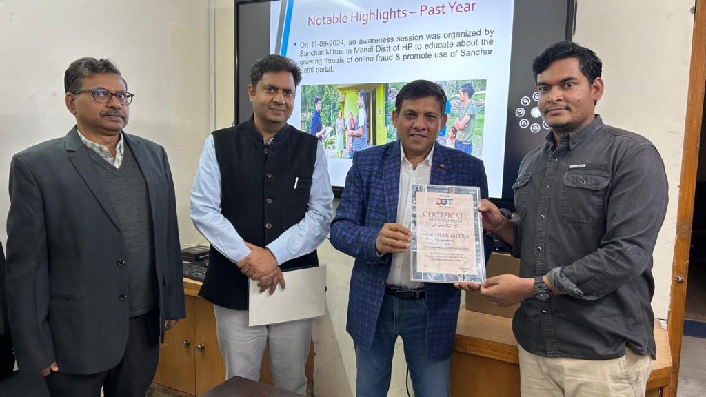 Shimla, May 5, 2025 – The Additional Director General Telecom, HP LSA, awarded Certificates of Recognition to student volunteers from IIT Mandi for their remarkable efforts under the #SancharMitra Scheme, promoting digital awareness & telecom outreach. @DoT_India